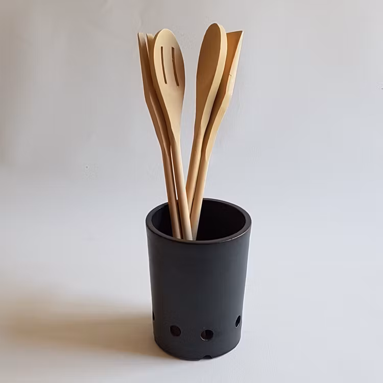 Rakt snyggt handdrejat bestickställ i stengods. Perfekt för dig som har diskmaskin eller lite disk. Använd även som slevställ. Höjd ca 13 cm, diameter ca 9 cm. Tål maskindisk, vid tex rengöring.
