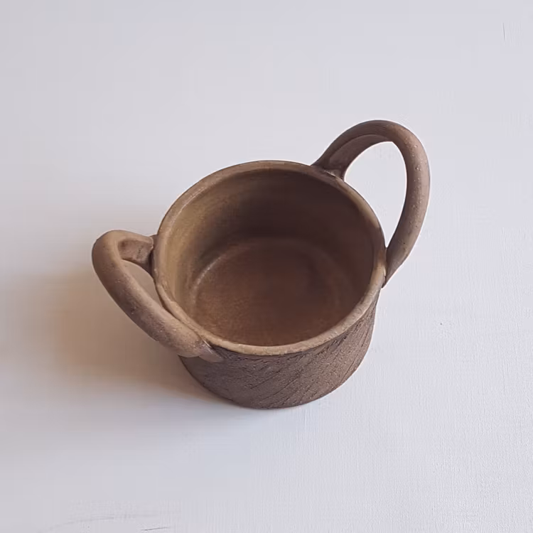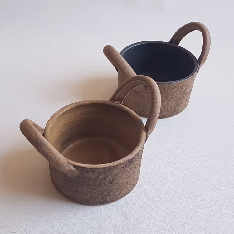 Den här serien har en rustik karaktär. Glasyren är sandfärgad och mjuk på insidan och kanten, medan utsidan är rå med struktur. Inget bly eller kadmium ingår i mina glasyrer.