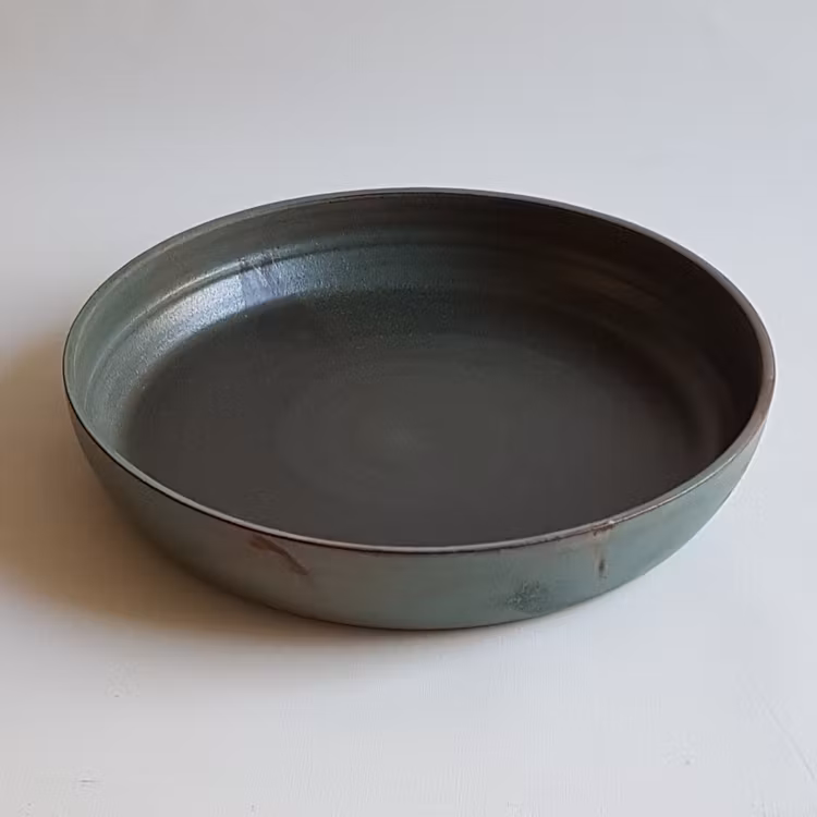 Handdrejad pajform i eldfast stengods. Tål även maskindisk & mikro. Ställ ej formen på kallt underlag när den är het. Även snyggt som salladsfat, fruktfat och uppläggningsfat. Eller varför inte ugnsbakade rotfrukter, potatis eller något annat tillbehör. Kött, fisk eller kyckling. Använd den så ofta du bara kan. Ca 30 cm i diameter, 5 cm hög. Rymmer ca 1,2 L. Finns också i en mindre storlek.