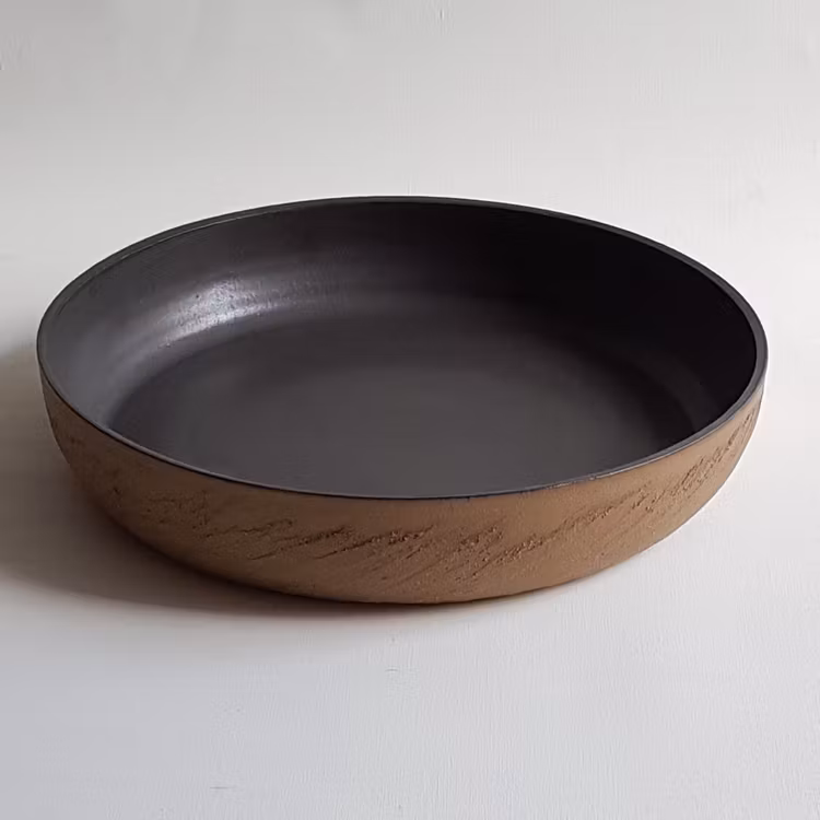 Handdrejad pajform i eldfast stengods. Tål även maskindisk & mikro. Ställ ej formen på kallt underlag när den är het. Även snyggt som salladsfat, fruktfat och uppläggningsfat. Eller varför inte ugnsbakade rotfrukter, potatis eller något annat tillbehör. Kött, fisk eller kyckling. Använd den så ofta du bara kan. Ca 30 cm i diameter, 5 cm hög. Rymmer ca 1,2 L. Finns också i en mindre storlek.