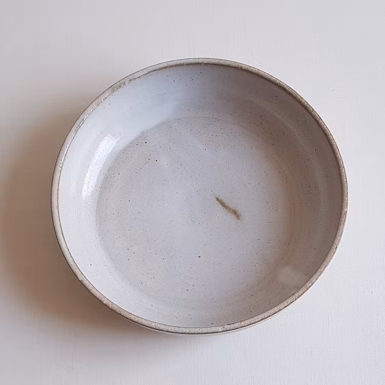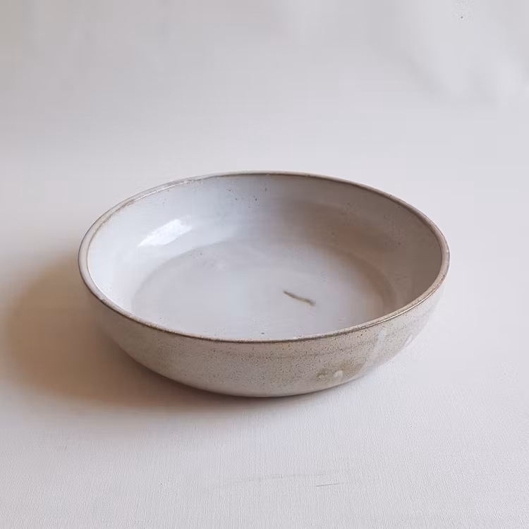 Den här serien kallar jag för Crème. Det är en högblank glasyr som skiftar ifrån vit till gräddvit och blir ibland nästan lite sandfärgad där lerfärgen går igenom. En väldigt mjuk och behaglig blank glasyr. Prickarna som blir är ett genomslag ifrån leran. Inget bly eller kadmium ingår i mina glasyrer.