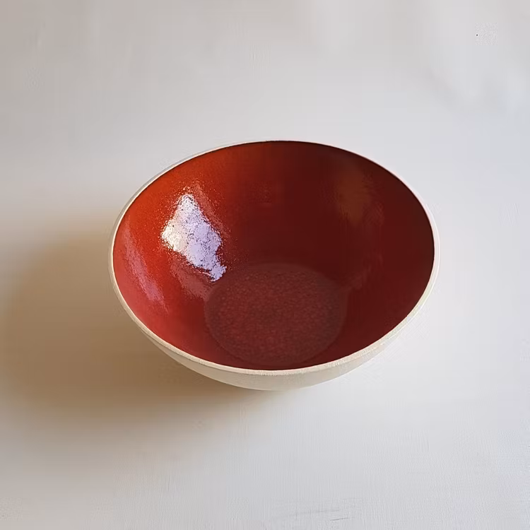 Den här serien kallar jag för Lava, det är en röd /orange glasyr som ibland går åt det mer orangea hållet och ibland blir den alldeles djupröd. Det är en högblank glasyr och jag använder den på en vit grov lera. Utsidan på godset blir då rå och sträv medan insidan "glöder" Just därför kallar jag den här serien för Lava serien. Ofta tar jag bort glasyren på kanten på tex skålen, det ger en skarp kontrast med det vita mot det röda. Variationen på färgen är inget jag kan styra över. Inget bly eller kadmium ingår i mina glasyrer.