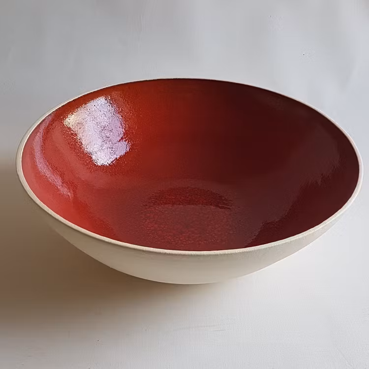Den här serien kallar jag för Lava, det är en röd /orange glasyr som ibland går åt det mer orangea hållet och ibland blir den alldeles djupröd. Det är en högblank glasyr och jag använder den på en vit grov lera. Utsidan på godset blir då rå och sträv medan insidan "glöder" Just därför kallar jag den här serien för Lava serien. Ofta tar jag bort glasyren på kanten på tex skålen, det ger en skarp kontrast med det vita mot det röda. Variationen på färgen är inget jag kan styra över. Inget bly eller kadmium ingår i mina glasyrer.