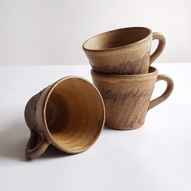 Den här serien har en rustik karaktär. Glasyren är sandfärgad och mjuk på insidan och kanten, medan utsidan är rå med struktur. Inget bly eller kadmium ingår i mina glasyrer.
