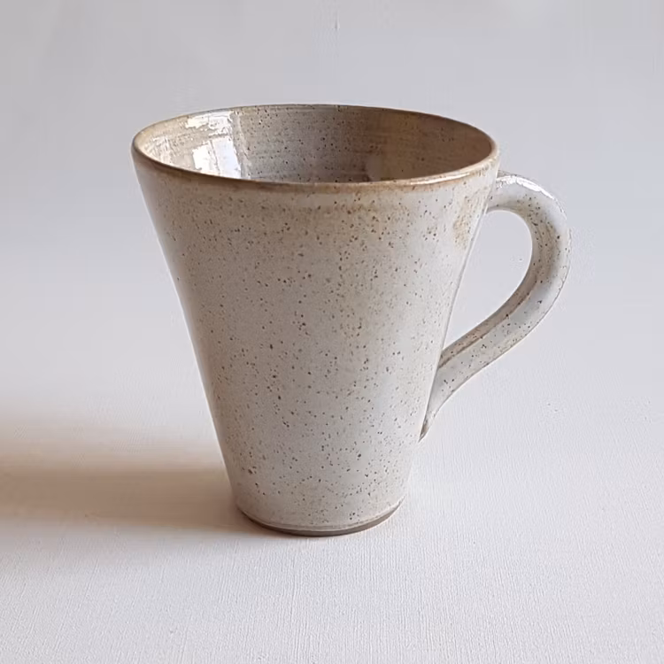 Handdrejad kaffekopp i sandfärgad stengodslera. Passar de flesta kaffemaskiner. Tål maskindisk och mikro. Det här är koppen som är ”lagom stor”. Höjd ca 10 cm, diameter ca 9 cm. Rymmer ca 2,5 dl.