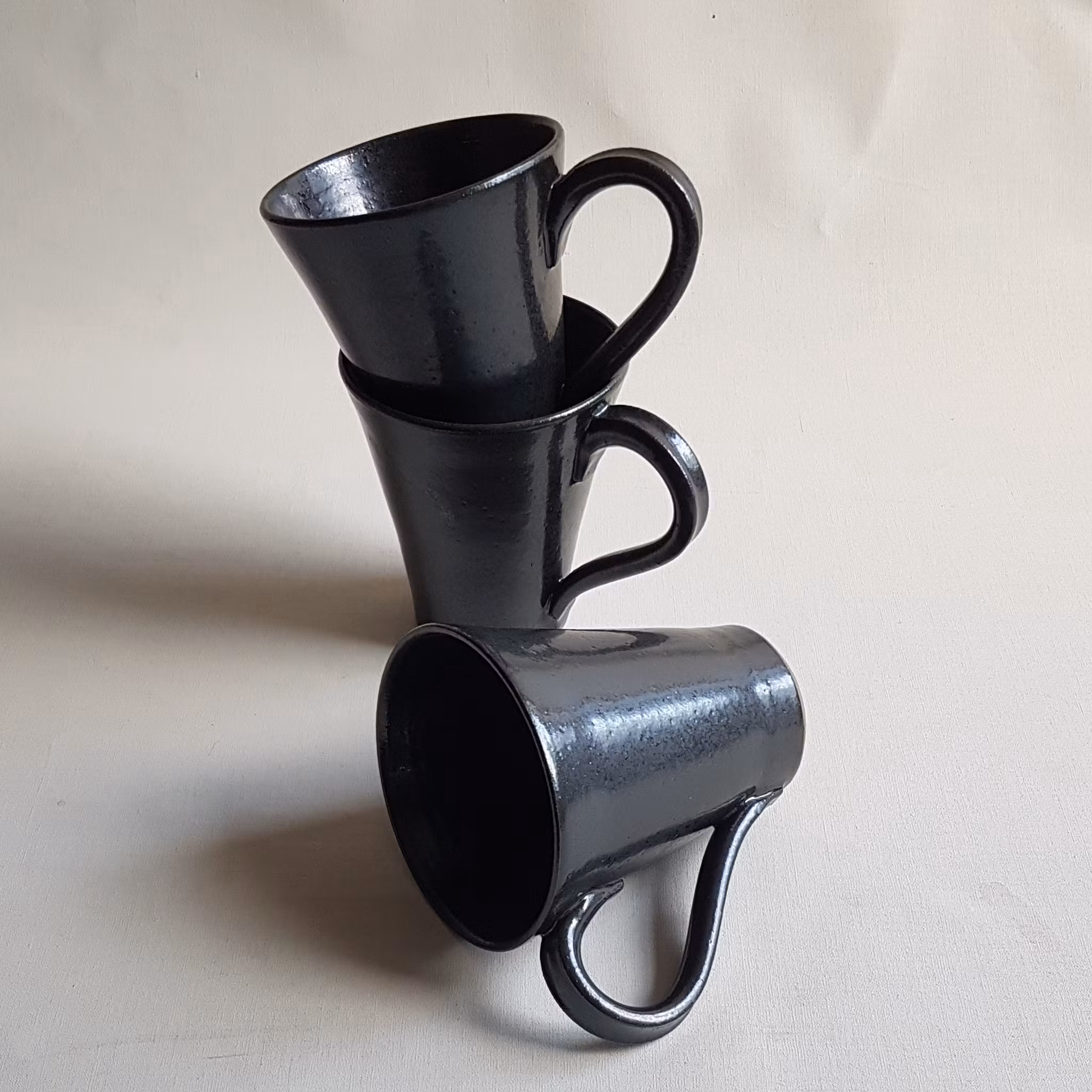 Den här serien kallar jag för Skiffer / svart blank. Om jag ska försöka beskriva den så är glasyren mjuk i känslan. Den har en ”oljig” svart ton med en nyans av blågrönt i vissa lägen, därav går mina tankar till skifferolja. Inget bly eller kadmium ingår i mina glasyrer.