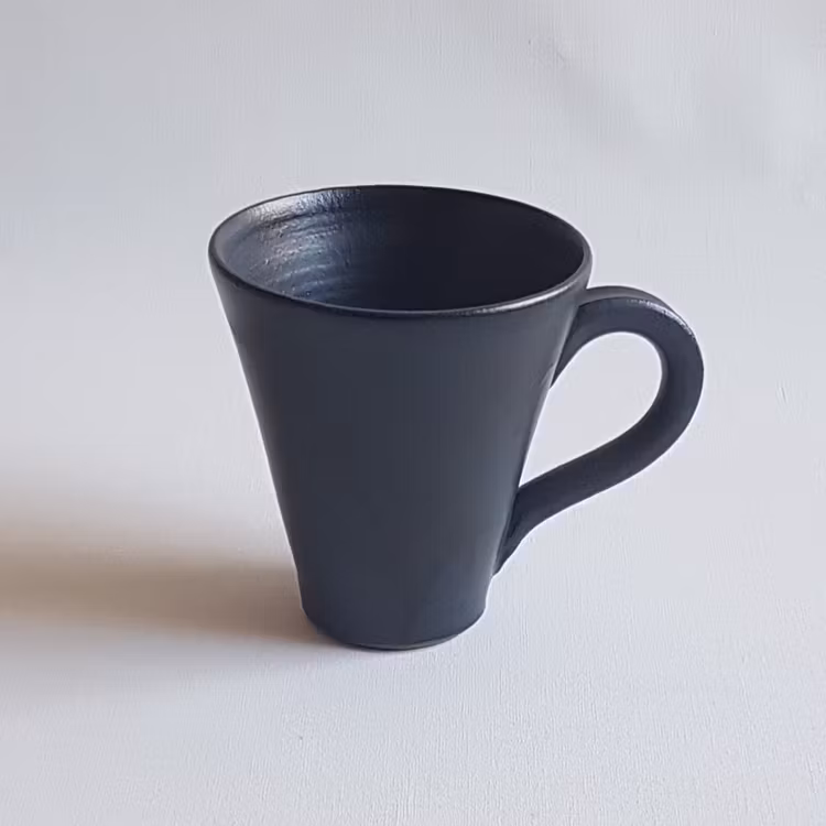Handdrejad kaffekopp i sandfärgad stengodslera. Passar de flesta kaffemaskiner. Tål maskindisk och mikro. Det här är koppen som är ”lagom stor”. Höjd ca 10 cm, diameter ca 9 cm. Rymmer ca 2,5 dl.