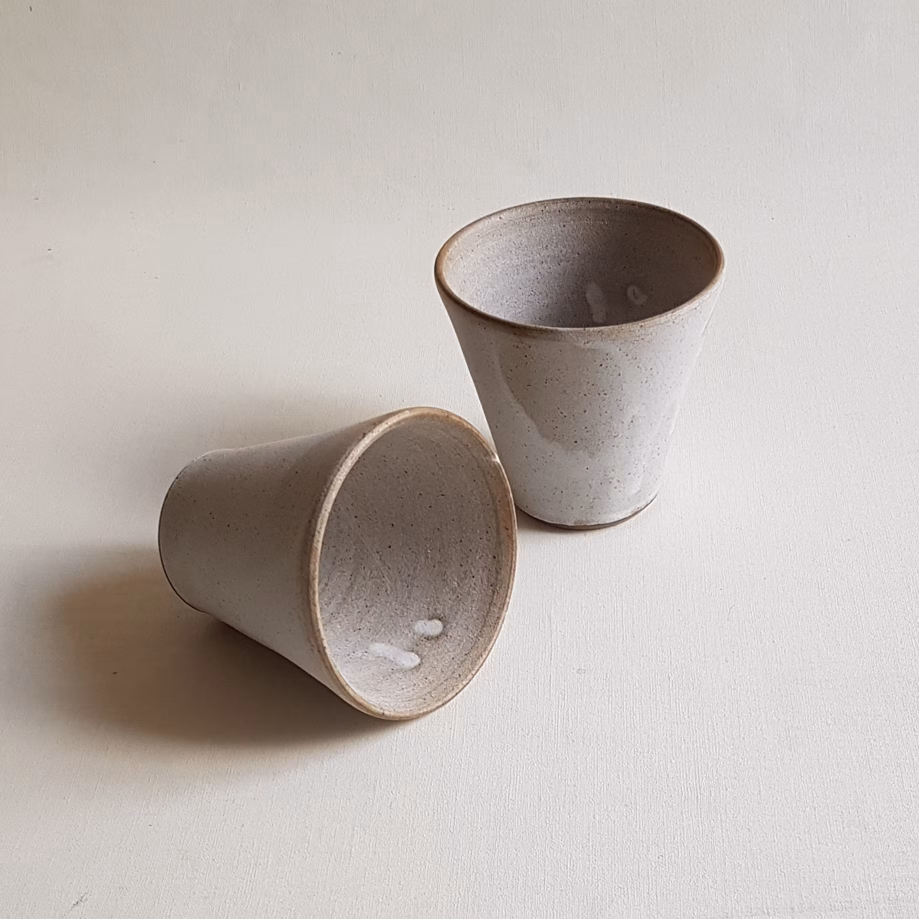 Handdrejad mindre mugg till tex kaffe, cappuccino eller vatten i sandfärgad stengodslera. Tål maskindisk och mikro. Passar bra till kaffemaskinen. Är Stapelbar. Höjd ca 8 cm, diameter ca 8 cm. Rymmer ca 1,5 dl