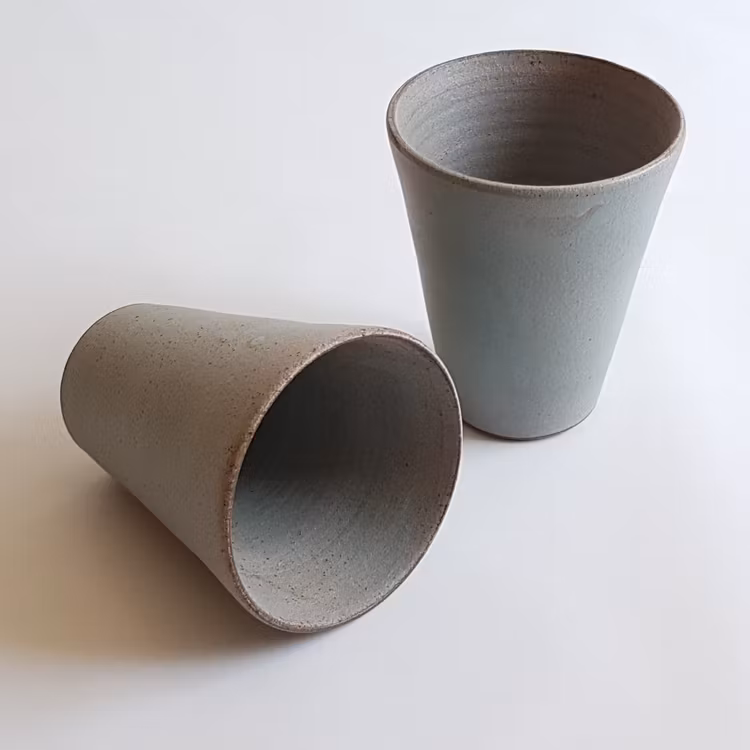 Handdrejad kaffemugg i sandfärgad stengodslera. Passar de flesta kaffemaskiner. Tål maskindisk och mikro. Det här är en kaffemugg som är ”lagom stor” och staplingsbar. Höjd ca 10 cm, diameter ca 9 cm. Rymmer ca 2,5 dl.