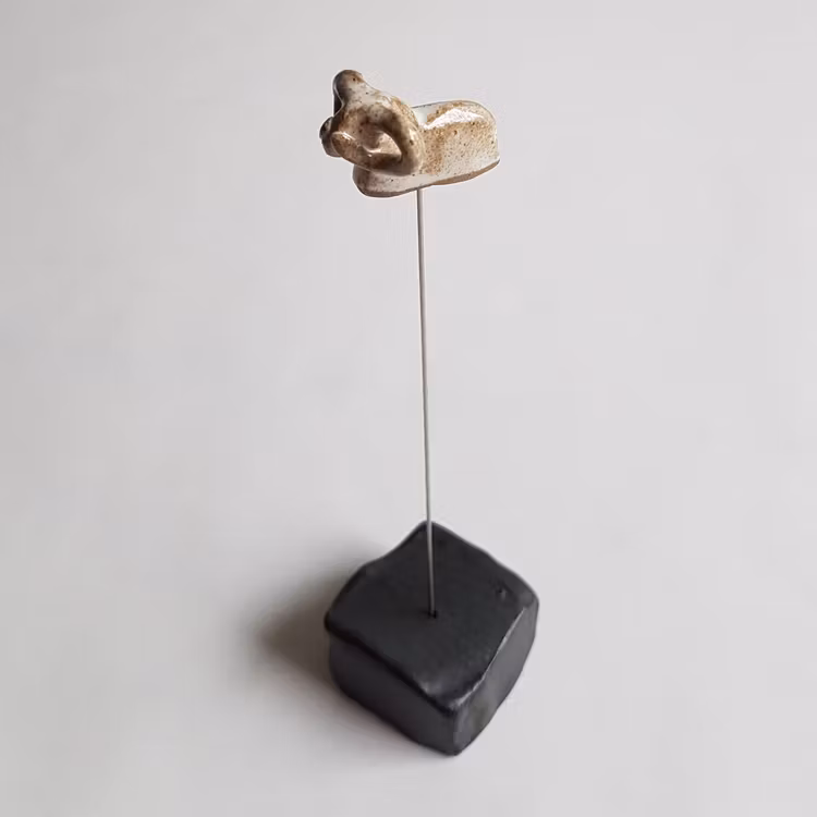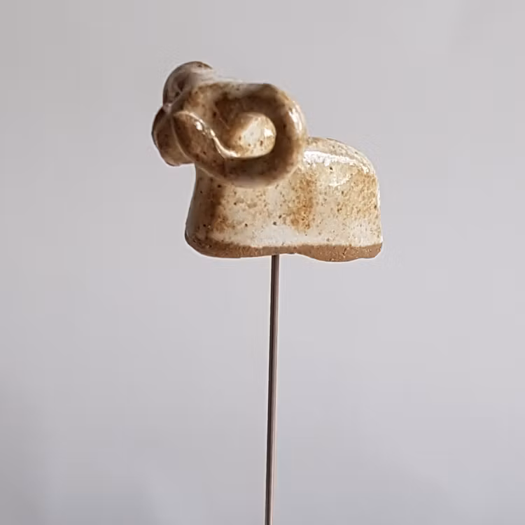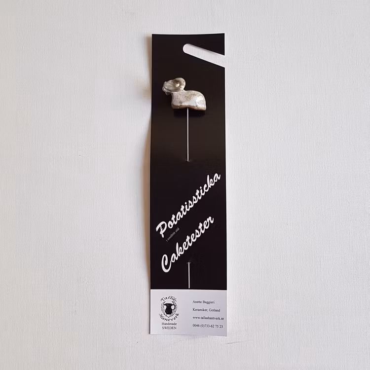 Potatissticka med en liten handgjord skulptur föreställande en bagge, totalt ca 16 cm. Baggen är gjord i stengods, hornen är tunna så hantera den varsamt. Själva stickan är i rostfritt stål och limmad med miljövänligt tvåkomponentslim. Handdiskas!