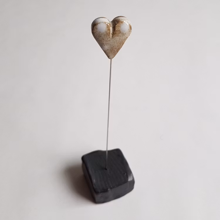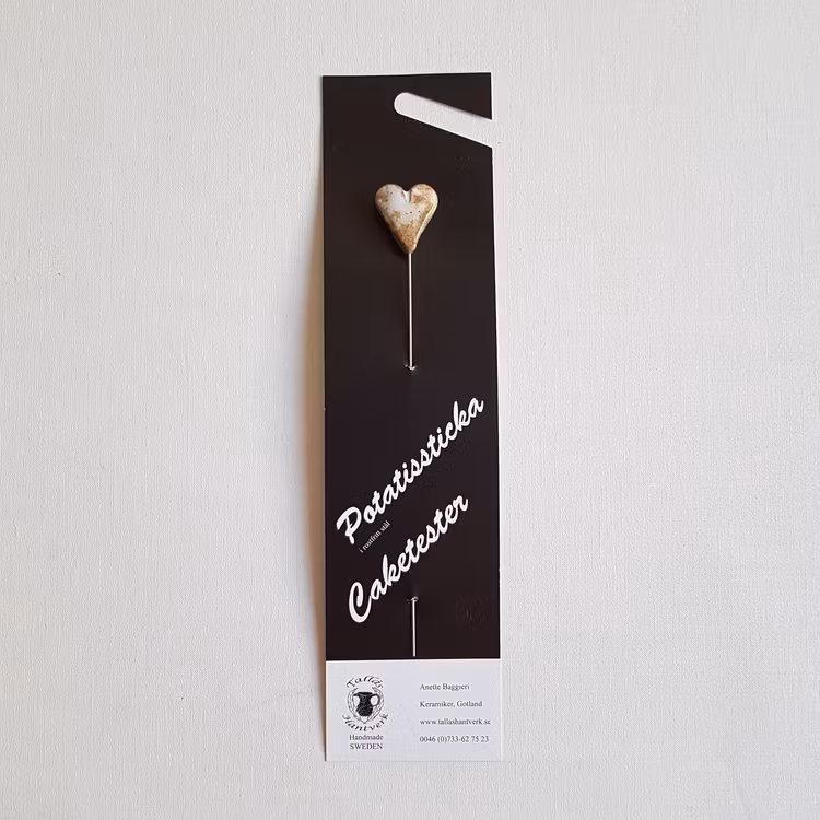 Potatissticka med en liten handgjord ”relief” föreställande ett hjärta, totalt ca 16 cm. Hjärtat är gjort i stengods. Själva stickan är i rostfritt stål och limmad med miljövänligt tvåkomponentslim. Handdiskas!