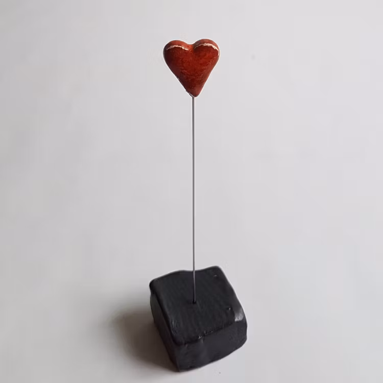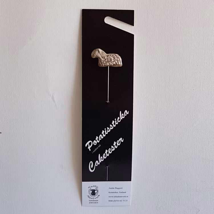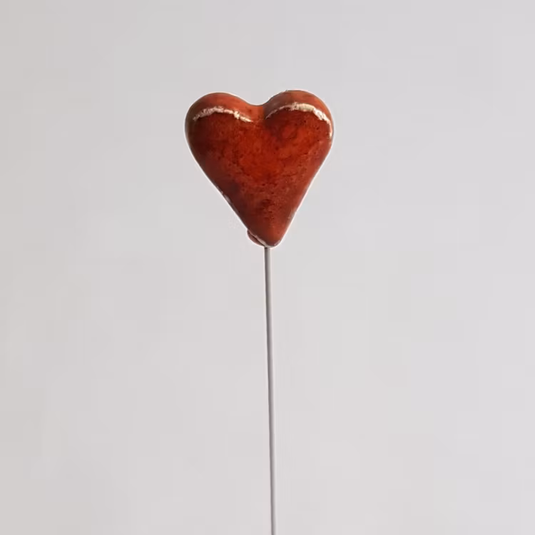 Potatissticka med en liten handgjord ”relief” föreställande ett hjärta, totalt ca 16 cm. Hjärtat är gjort i stengods. Själva stickan är i rostfritt stål och limmad med miljövänligt tvåkomponentslim. Handdiskas!
