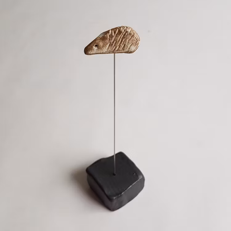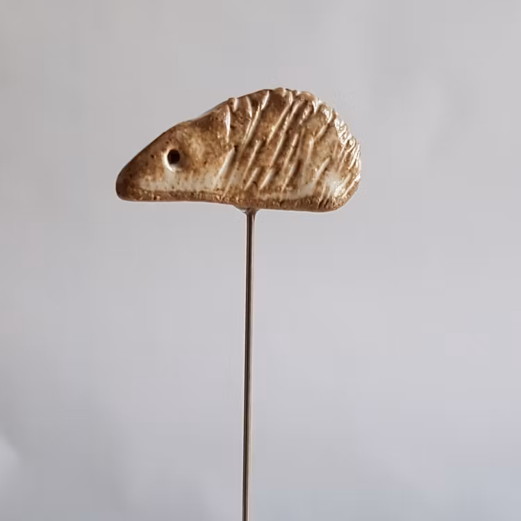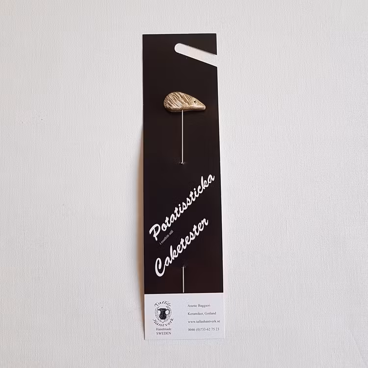 Potatissticka med en liten handgjord skulptur föreställande en igelkott totalt ca 16 cm. Igelkotten är gjord i stengods. Själva stickan är i rostfritt stål och limmad med miljövänligt tvåkomponentslim. Handdiskas!