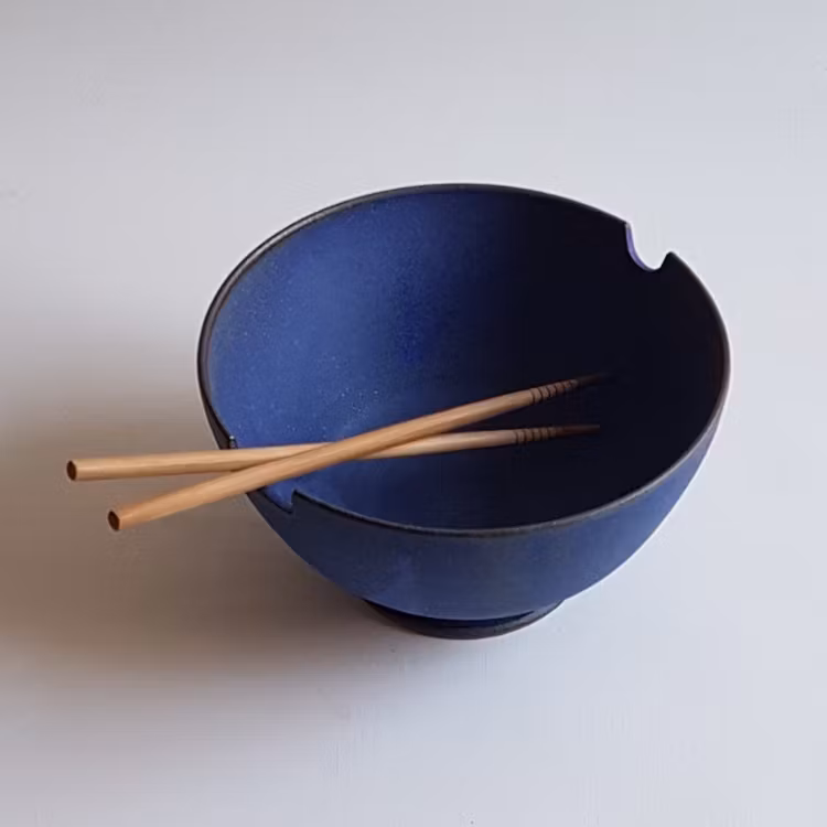 En handdrejad ramenskål i sandfärgad stengodslera, med praktiska ”hållare” för ätpinnar. Obs! Pinnarna ingår inte. Ca 18 cm i diameter, höjd ca 10 cm. Rymmer ca 8 dl.