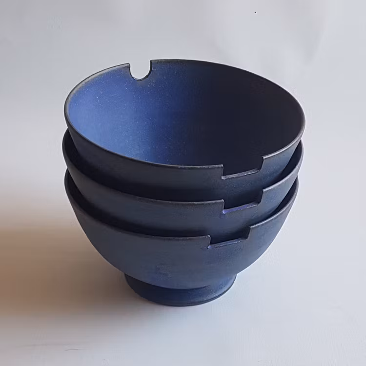 Den blå serien har även den en rustik karaktär, man kan säga lite sträv. Glasyren är på vissa ställen intensivt blå medan andra delar på samma föremål kan gå mot mörkt brunt, och med prickar som påminner om en stjärnhimmel. Eller Mareld, ett naturfenomen man hittar främst på västkusten i Sverige. Det är som små stjärnor som lyser vackert i vattnet om natten, när man rör om i det eller badar. Inget bly eller kadmium ingår i mina glasyrer.