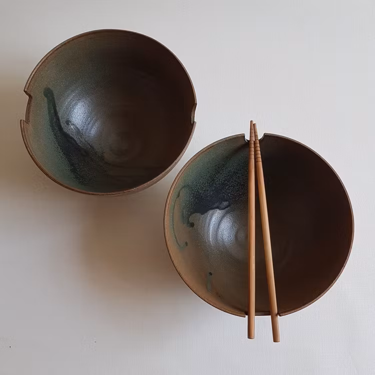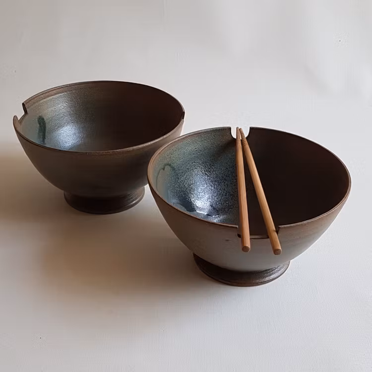En handdrejad ramenskål i sandfärgad stengodslera, med praktiska ”hållare” för ätpinnar. Obs! Pinnarna ingår inte. Ca 18 cm i diameter, höjd ca 10 cm. Rymmer ca 8 dl.