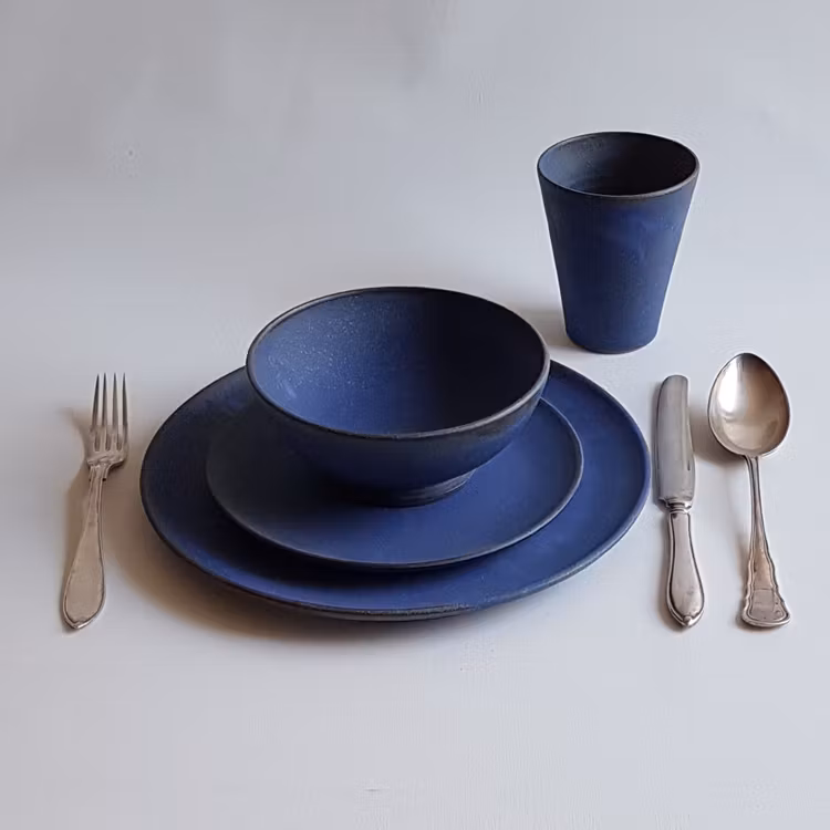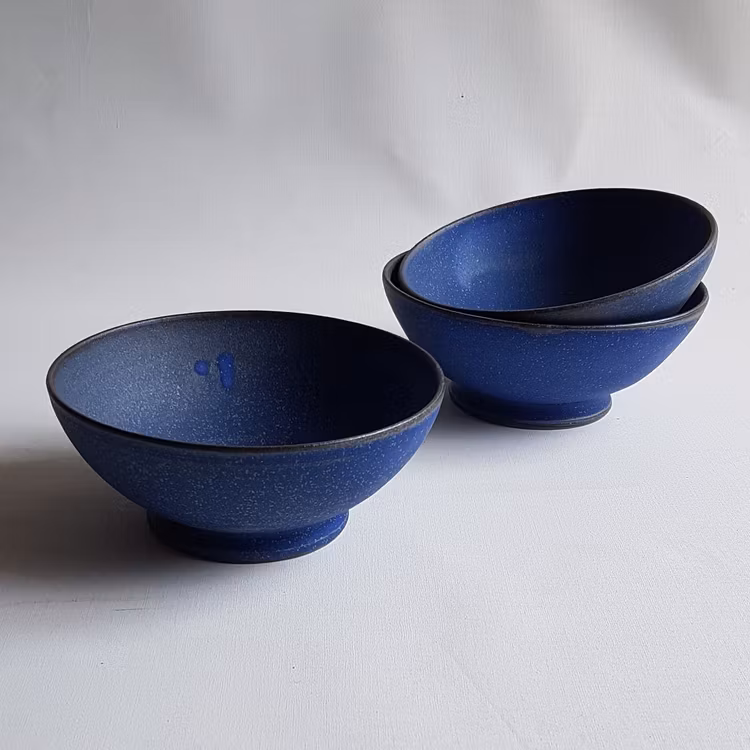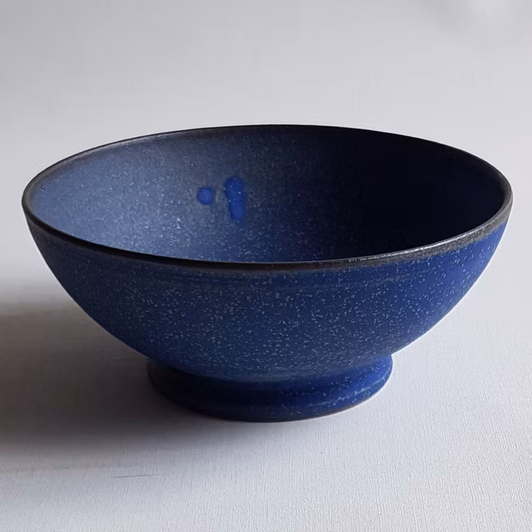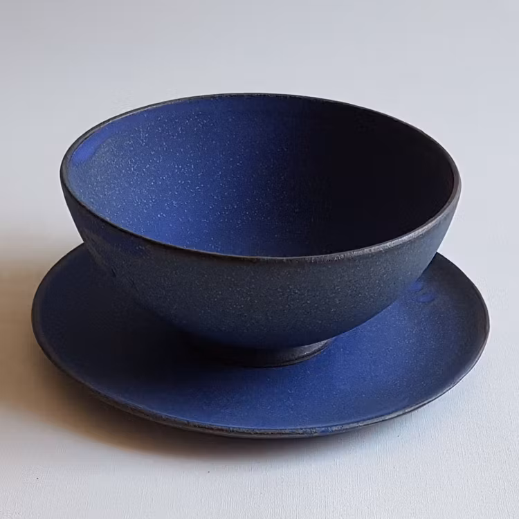 Den blå serien har även den en rustik karaktär, man kan säga lite sträv. Glasyren är på vissa ställen intensivt blå medan andra delar på samma föremål kan gå mot mörkt brunt, och med prickar som påminner om en stjärnhimmel. Eller Mareld, ett naturfenomen man hittar främst på västkusten i Sverige. Det är som små stjärnor som lyser vackert i vattnet om natten, när man rör om i det eller badar. Inget bly eller kadmium ingår i mina glasyrer.