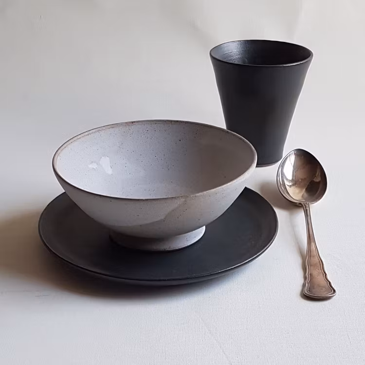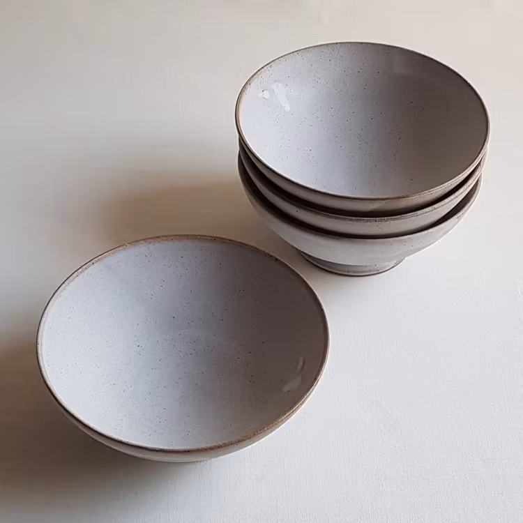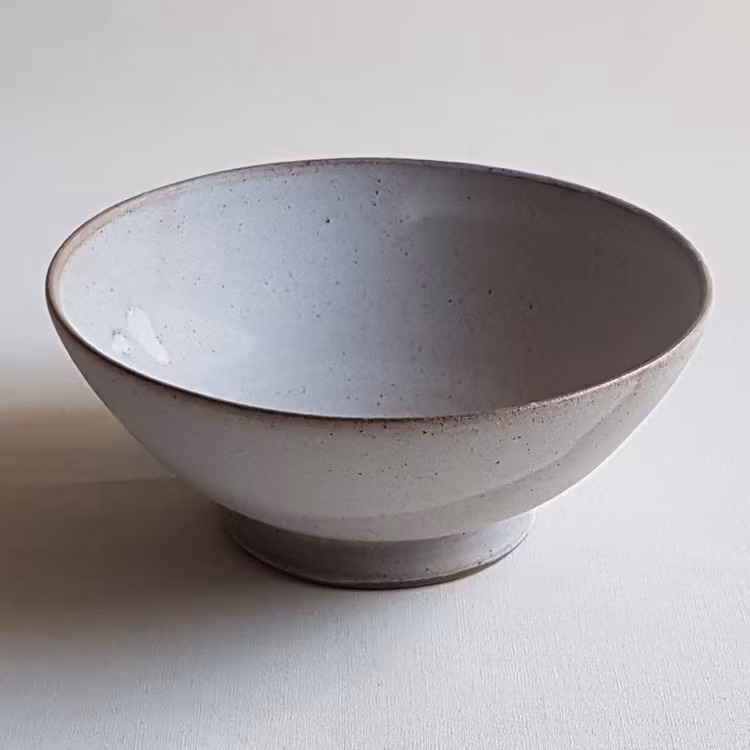 Den här soppskålen är glaserad i glasyren som jag kallar jag för frost. I känslan är den lite sträv och påminner om frosten på en ruta en kall vårmorgon. Färgen är vit och ibland lyser lerans färg igenom, då går tankarna till naturen. Frostigt vit, och på vissa delar lyser lerfärgen igenom som på ett frostigt torkat löv eller en gren.