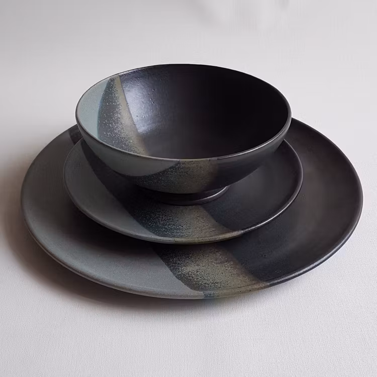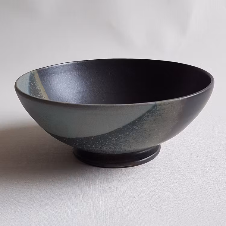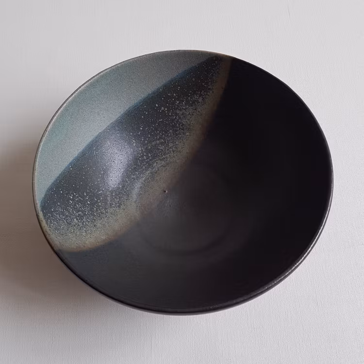 Den här serien kallar jag för Horisont, som blir en effekt när jag blandar den svarta och den grågröna glasyren. Den svarta glasyren är glasyren mjuk i känslan. Färgen påminner om svart / grå granit. Den kombinerar jag med den grågröna glasyren, Den är ganska mjuk, matt men inte sträv och har ett slags diskret skimmer över sig. När jag kombinerar dom så dom överlappar varandra uppstår en tredje färg. Som om blir en mörkare turkos, åt det blåa hållet, en fin effekt, liksom en horisont.Inget bly eller kadmium ingår i mina glasyrer.