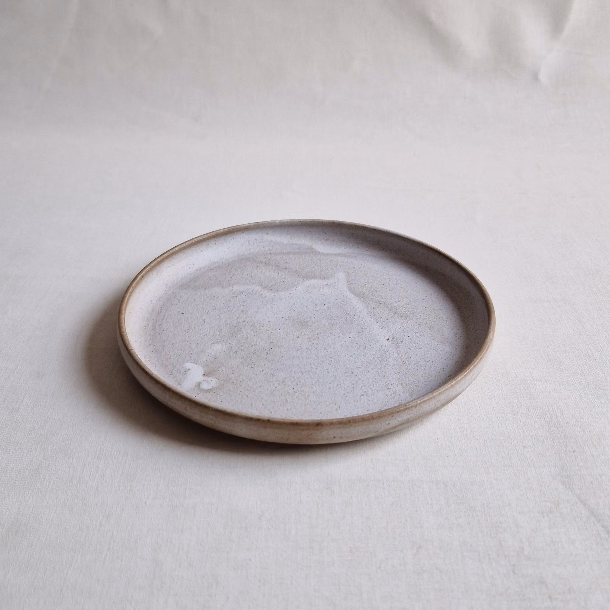 En handdrejad assiett i sandfärgad stengodslera som passar både till vardag och fest. Den är ca 19 cm i diameter och har en lite högre markerad kant. Tål maskindisk och mikro.