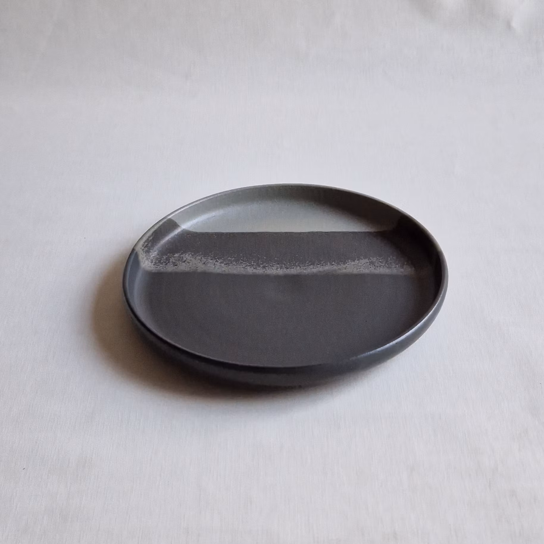Den här serien kallar jag för Horisont, som blir en effekt när jag blandar den svarta och den grågröna glasyren. Den svarta glasyren är mjuk i känslan. Färgen påminner om svart / grå granit. Den kombinerar jag med den grågröna glasyren. Den är ganska mjuk, matt men inte sträv och har ett slags diskret skimmer över sig. När jag kombinerar dom så dom överlappar varandra uppstår en tredje färg. Som om blir en mörkare turkos, åt det blåa hållet, en fin effekt, liksom en horisont.