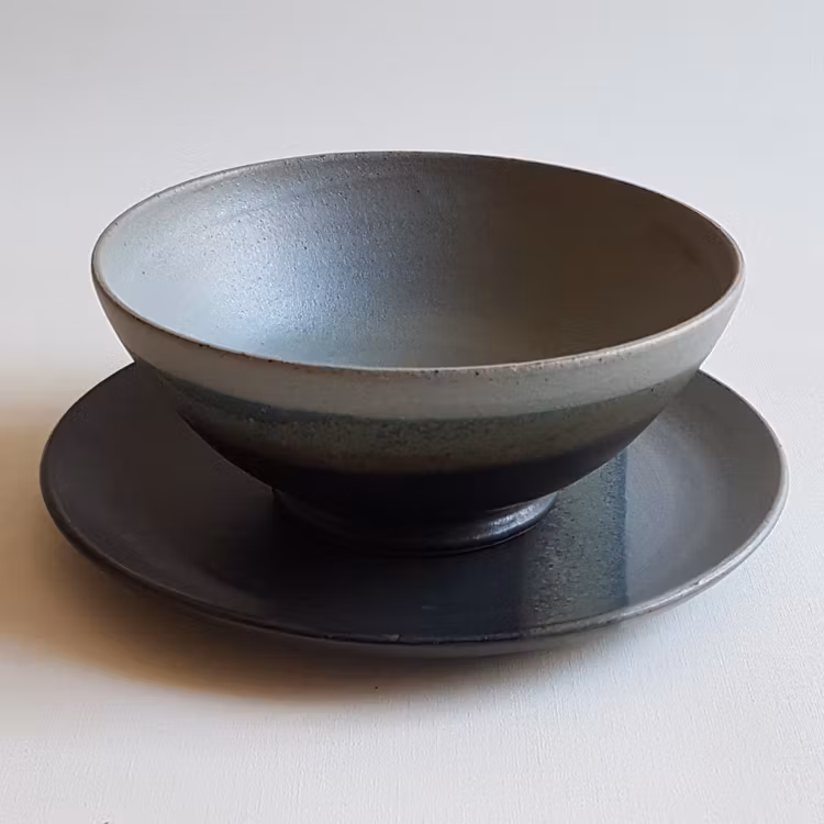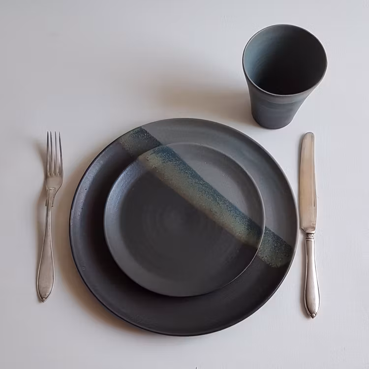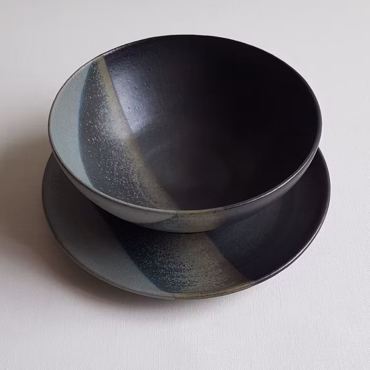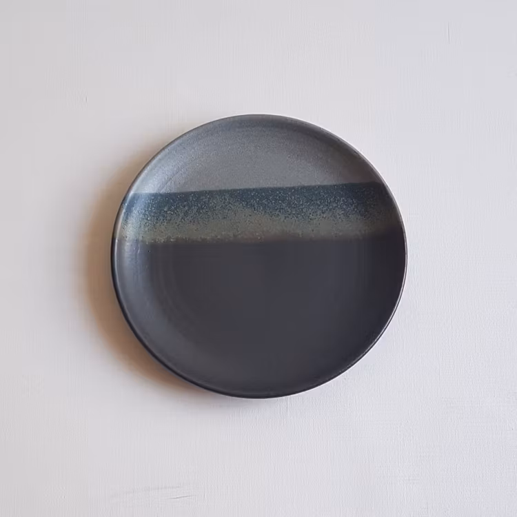 Den här serien kallar jag för Horisont, som blir en effekt när jag blandar den svarta och den grågröna glasyren. Den svarta glasyren är mjuk i känslan. Färgen påminner om svart / grå granit. Den kombinerar jag med den grågröna glasyren. Den är ganska mjuk, matt men inte sträv och har ett slags diskret skimmer över sig. När jag kombinerar dom så dom överlappar varandra uppstår en tredje färg. Som om blir en mörkare turkos, åt det blåa hållet, en fin effekt, liksom en horisont.