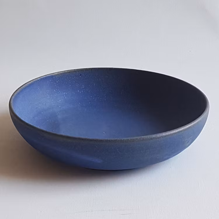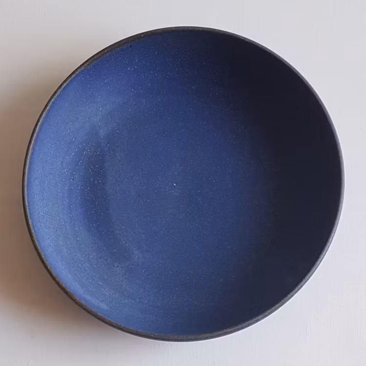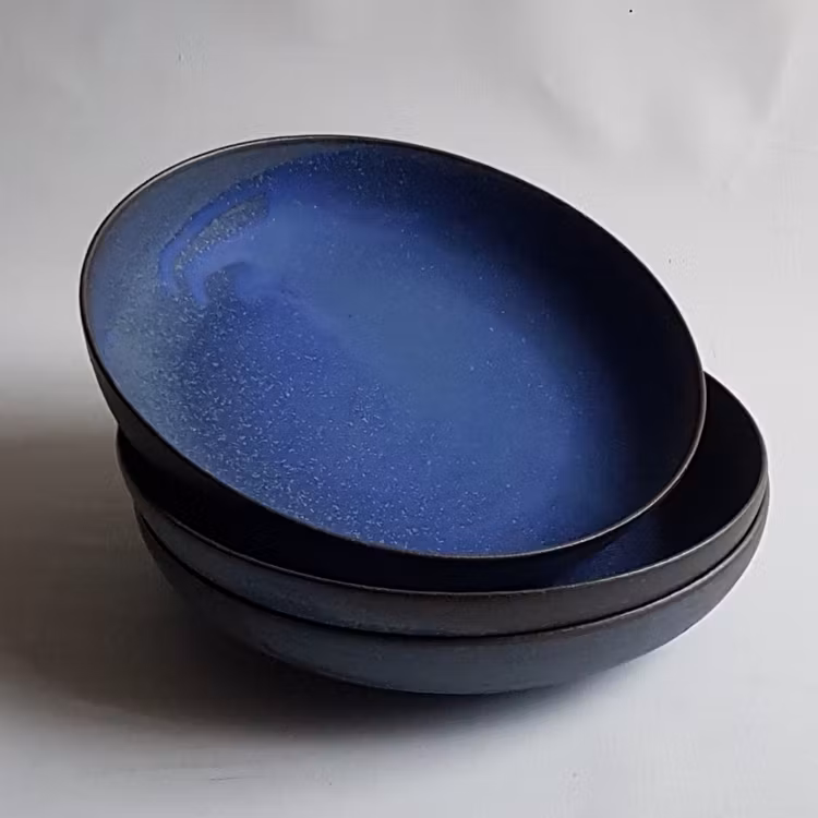 Den blå serien har även den en rustik karaktär, man kan säga lite sträv. Glasyren är på vissa ställen intensivt blå medan andra delar på samma föremål kan gå mot mörkt brunt, och med prickar som påminner om en stjärnhimmel. Eller Mareld, ett naturfenomen man hittar främst på västkusten i Sverige. Det är som små stjärnor som lyser vackert i vattnet om natten, när man rör om i det eller badar. Inget bly eller kadmium ingår i mina glasyrer.