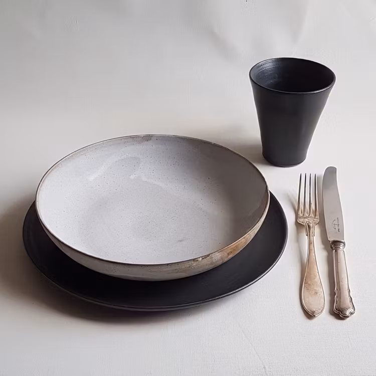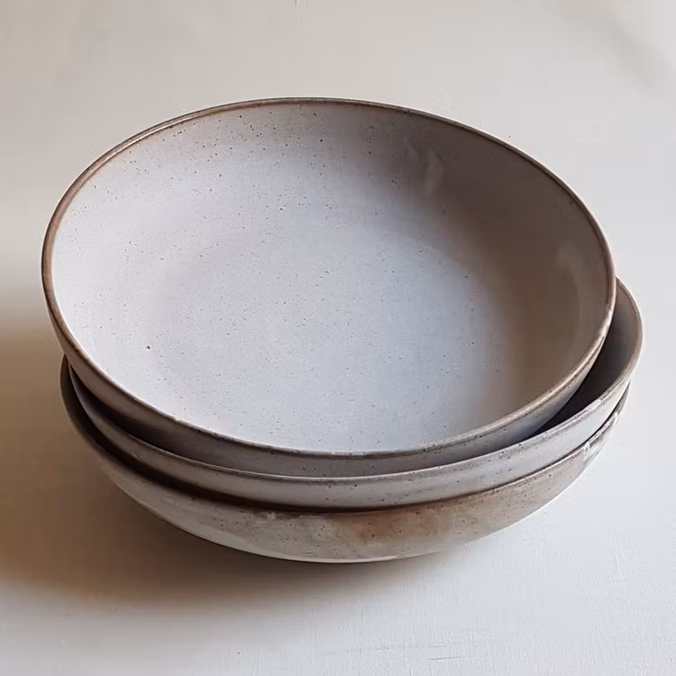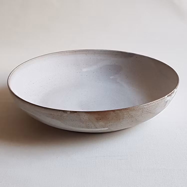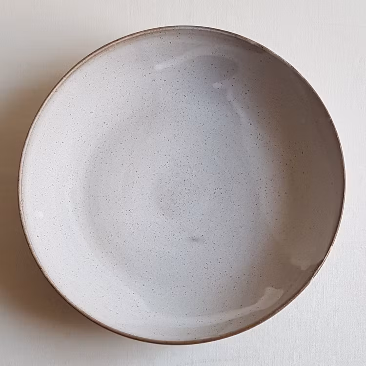 Den här djuptallriken är glaserad i glasyren som jag kallar jag för frost. I känslan är den lite sträv och påminner om frosten på en ruta en kall vårmorgon. Färgen är vit och ibland lyser lerans färg igenom, då går tankarna till naturen. Frostigt vit, och på vissa delar lyser lerfärgen igenom som på ett frostigt torkat löv eller en gren.