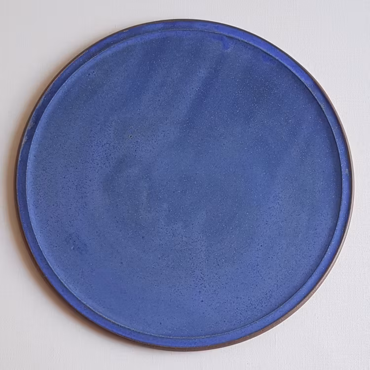 Den blå serien har även den en rustik karaktär, man kan säga lite sträv. Glasyren är på vissa ställen intensivt blå medan andra delar på samma föremål kan gå mot mörkt brunt, och med prickar som påminner om en stjärnhimmel. Eller Mareld, ett naturfenomen man hittar främst på västkusten i Sverige. Det är som små stjärnor som lyser vackert i vattnet om natten, när man rör om i det eller badar. Inget bly eller kadmium ingår i mina glasyrer.
