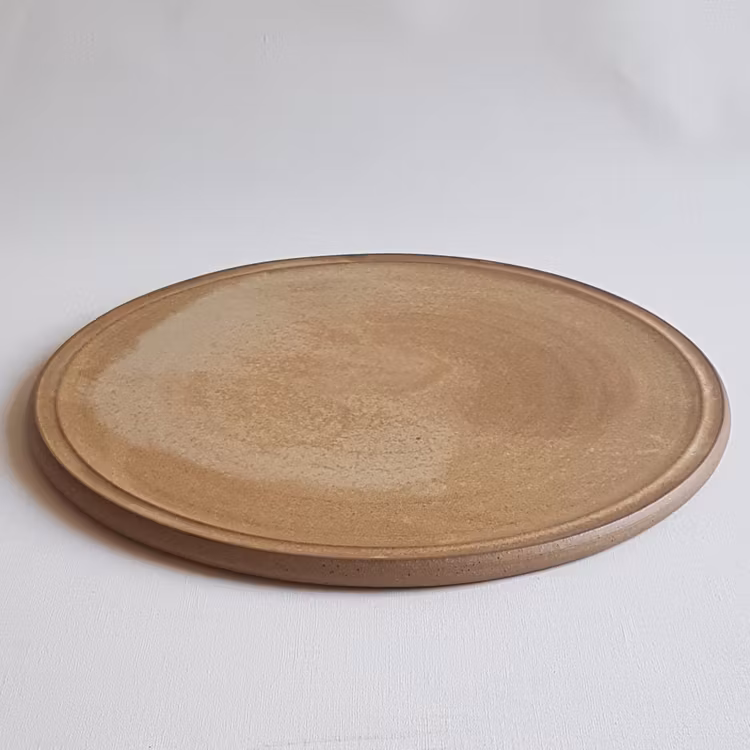 Handdrejad ostbricka i Sandfärgad stengodslera. Använd även som tårtfat, uppläggningsfat och ljusfat. Ca 30 Cm i diameter. Tål maskindisk och mikro.