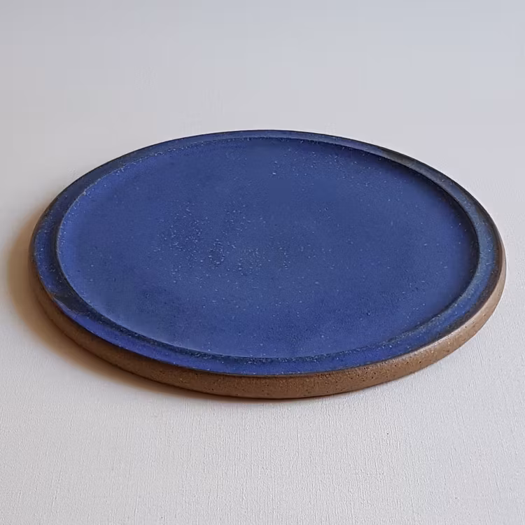Den blå serien har även den en rustik karaktär, man kan säga lite sträv. Glasyren är på vissa ställen intensivt blå medan andra delar på samma föremål kan gå mot mörkt brunt, och med prickar som påminner om en stjärnhimmel. Eller Mareld, ett naturfenomen man hittar främst på västkusten i Sverige. Det är som små stjärnor som lyser vackert i vattnet om natten, när man rör om i det eller badar. Inget bly eller kadmium ingår i mina glasyrer.
